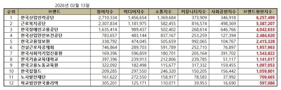 한국기업평판연구소 ( 소장 구창환 ) 는 국내 브랜드의 평판지수를 매달 측정하여 브랜드 평판지수의 변화량을 발표하고 있다. 2026년 2월 고용노동부 공공기관 브랜드평판지수는 2026년 1월 13일부터 2026년 2월 13일까지의 12개 고용노동부 공공기관 브랜드에 대한 빅데이터 분석 결과이다.