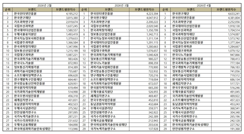 과학기술정보통신부 공공기관 브랜드평판 2026년 4월 빅데이터 분석결과, 1위 한국연구재단 2위 한국인터넷진흥원 3위 기초과학연구원 순으로 분석되었다.