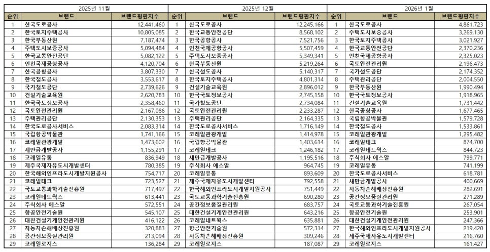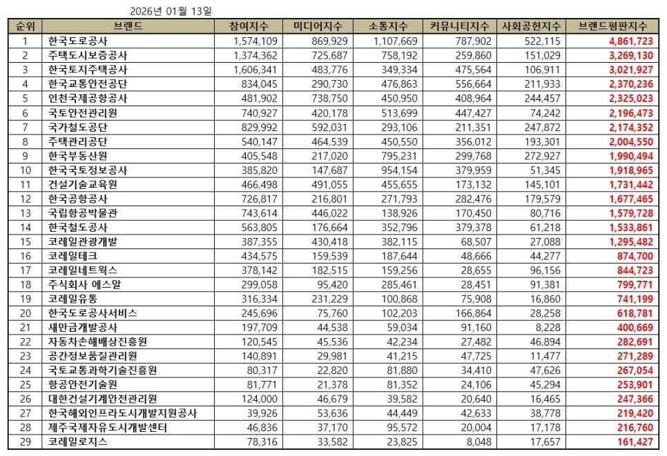 한국기업평판연구소 ( http://www.brikorea.com 소장 구창환 ) 는 국내 브랜드의 평판지수를 매달 측정하여 브랜드 평판지수의 변화량을 발표하고 있다. 2026년 1월 건축자재 상장기업 브랜드평판지수는 2025년 12월 13일부터 2026년 1월 13일까지의 30개 건축자재 상장기업 브랜드에 대한 빅데이터 분석 결과이다.